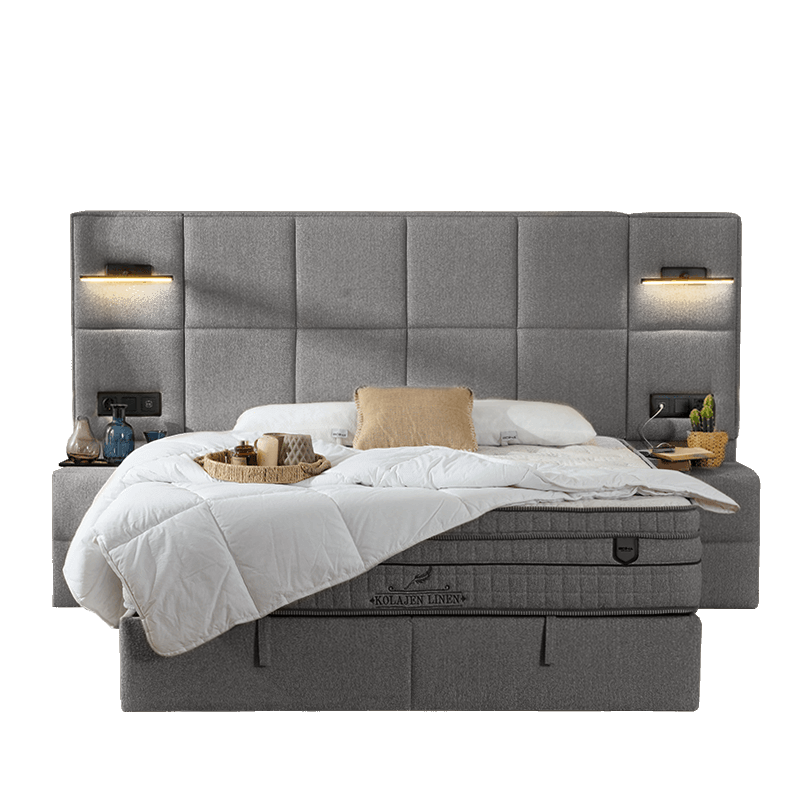 COMFORT е тапицирана спалня с включен матрак и размери 180 x 200 см. Има вграден амортисьор за лесно повдигане и обособена ракла за съхранение на завивки, дрехи и различни вещи. За максимален комфорт моделът разполага с широка табла от мека и приятна на допир дамаска, с LED осветление, USB портове и електрически контакти от двете страни. Нощните шкафчета не са включени в цената и може да ги намерите в таб/поле "Аксесоари". Пълна информация за размерите и характеристиките на модела ще намерите в таблицата в таб/поле "Техническа информация".