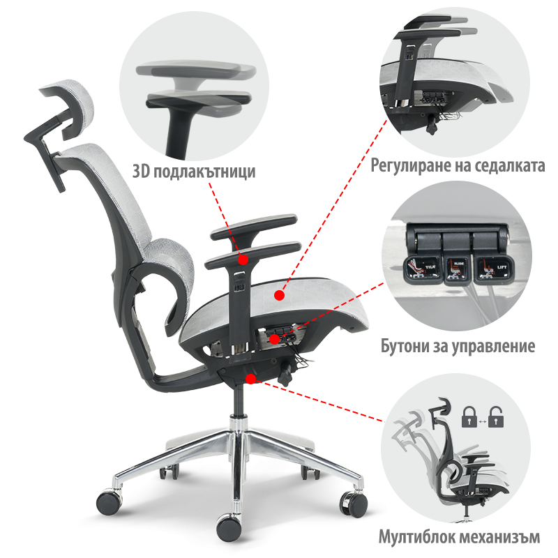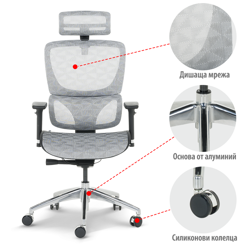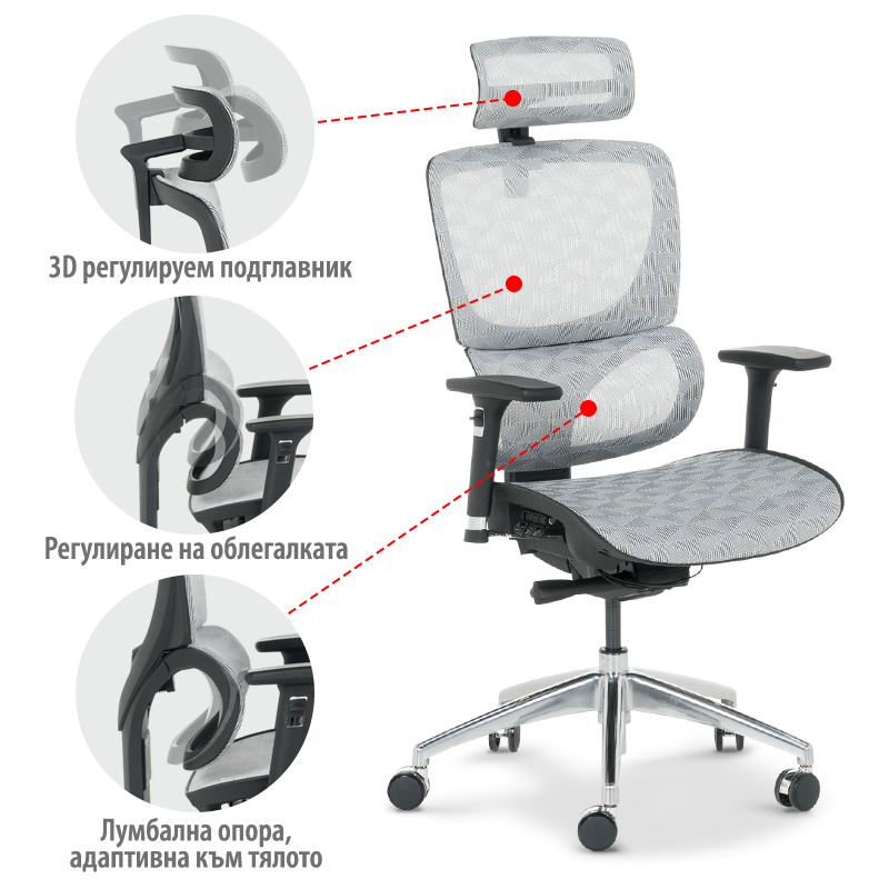Ергономичният стол DELTA е стилен и функционален избор за вашия дом или офис, който комбинира съвременен дизайн с изключителен комфорт и удобство. Този модел разполага с множество функции за персонализиране: 3D подглавник, 3D подлакътници, лумбална опора и облегалка и седалка от дишаща мрежа с ергономична форма. Здравата алуминиева основа и силиконовите колелца осигуряват стабилност и плавно движение, което го прави идеален за всеки, който цени качеството и ефективността.