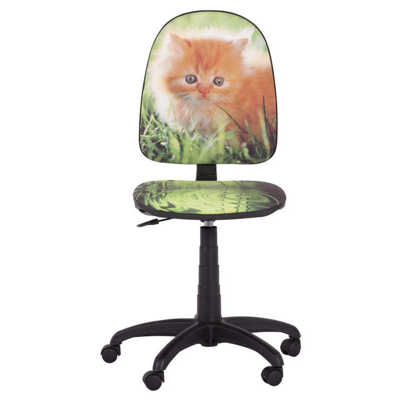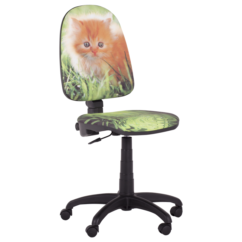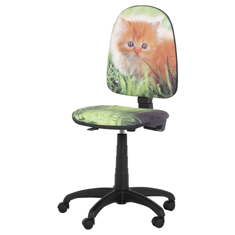 Детски стол Prestige - коте е удобен и функционален стол с качествена дамаска. Акцент при стола е апликацията на дамаската, която е със снимка на коте и пасва изключително добре на цветния интериор на детската стая.