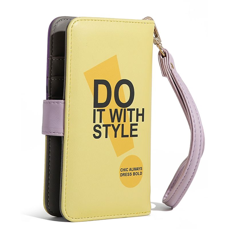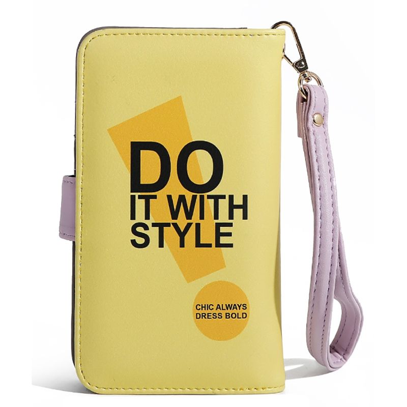 висококачествена еко кожа затваряне с капак с магнит плочка с гравирано лого обков в златист тон регулируем вътрешен плъзгащ се държач за телефон ( един размер, пасва за повечето телефони) два държача за карти, един джоб за банкноти включва подвижна каишка за китка ( 20,3 cm дилжина) размери: 8,9 cm дължина x 2,5 cm ширина x 16,5 cm височина