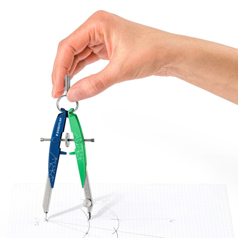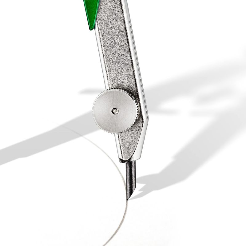 Висококачествен пергел с кръгла глава и централно колело. За окръжности с максимален диаметър 230 mm. Материал: здрава пластмаса и метал. Дължина 154 mm. Атрактивни цветови комбинации от синьо/ залено и синьо/ лилаво.