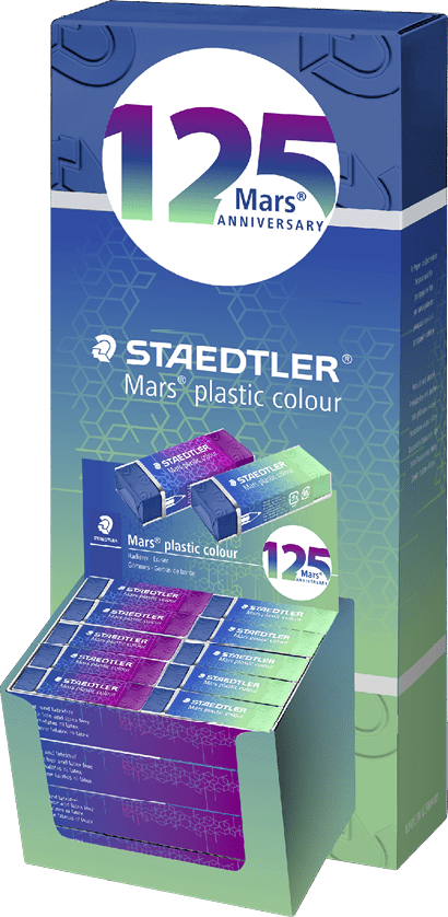 65 x 23 x 13 mm Дисплей с 40 броя Плъзгаща се картонена обвивка Минимална ронливост Устойчива на стареене Без фталат и латекс Атрактивни цветови комбинации от синьо/зелено и синьо/люляк