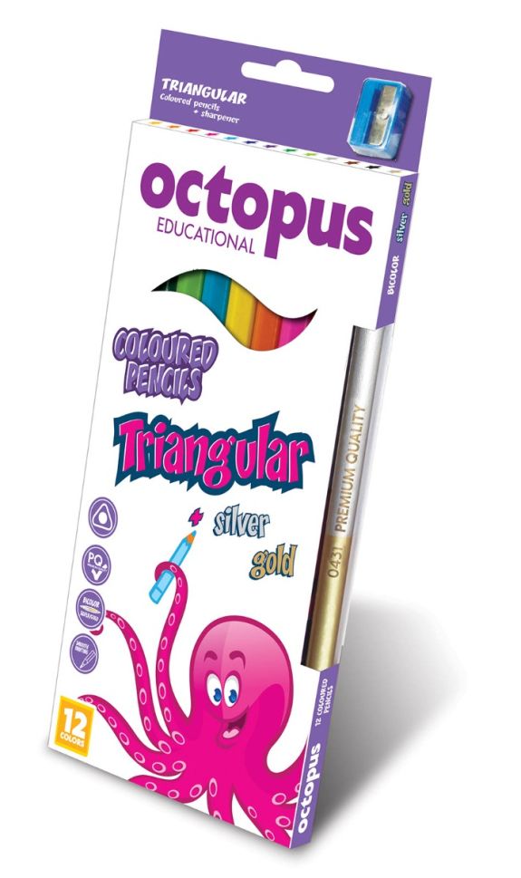 * 12 цвята * картонена кутия * гладко писане * острилка * ергономична триъгълна форма + златен/сребърен молив