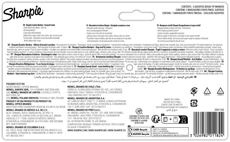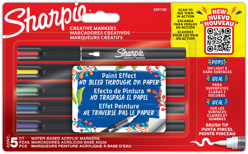 Вдъхнете живот на вашето въображение с акрилните маркери Sharpie Creative. Те създават привличащи вниманието изображения при писане, рисуване и оцветяване! Тези акрилни маркери се отличават с мастило с ефект на боя. Мастилото на водна основа няма да протече, така че работата ви остава чиста. Маркирите са с ярки цветове и с тях могат да се създават атрактивни творби върху повечето светли и тъмни повърхности като хартия, метал, дърво, керамика, стъкло, камък и платно. Цветовете се наслояват красиво, за да добавят измерение към вашата работа. Нещо повече, акрилните маркери Sharpie Creative нямаj нужда от разклащане - просто отворете капачката и започнете да творите! Сканирайте QR кода на опаковката и стартирайте приложение Sharpie A/R (Augmented Reality) за 3D визуализация на употребата на маркерите.