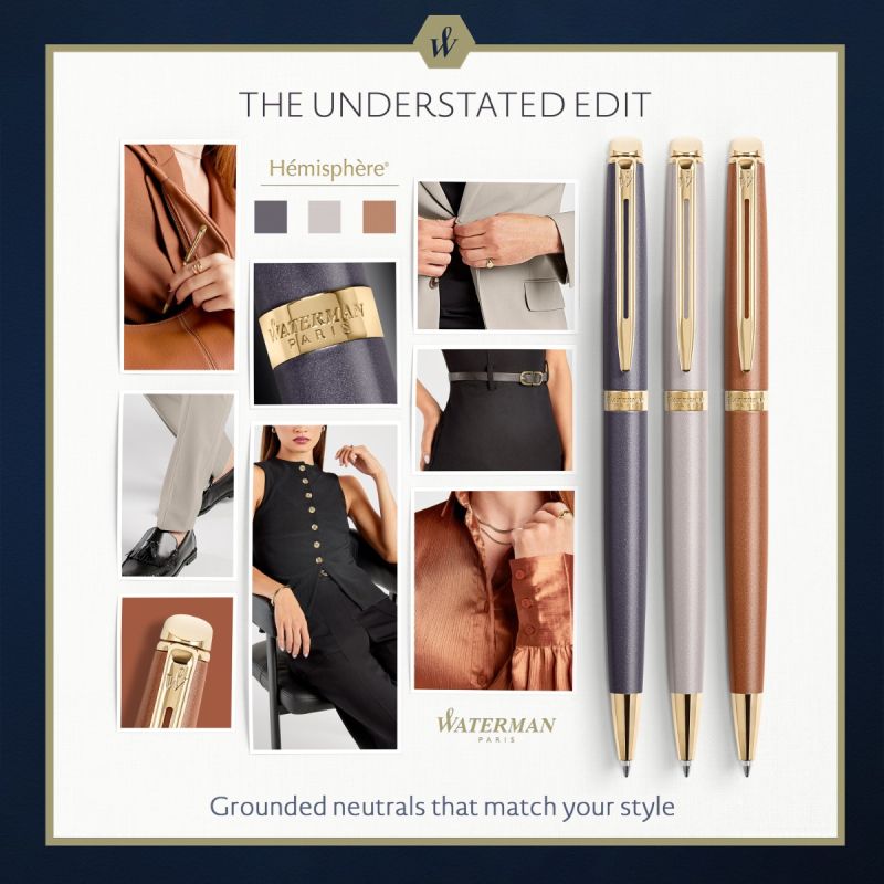 Вдъхновена от преминаването на модата към дискретен лукс, серията Hémisphère Understated Edit в Stone Greyосигурява перфектното неутрално съчетание с основните елементи на гардероба, сезон след сезон. С елегантен,тънък силует, серията е изработена от най-висококачествени материали. Тялото и капачката са завършени с луксозен металиков лак. Характерните за Waterman светло златисти клип и части добавят изискани детайли. Горна част със светло златисто покритие, гравирана с емблематичното "W", допълва стилния, транссезонен външен вид на пишещите средства. Както всички пишещи средства на Waterman, колекцията Hemisphere е произведена във Франция и се възползва от над 140 години опит впроизводството на изискани пишещи средства.