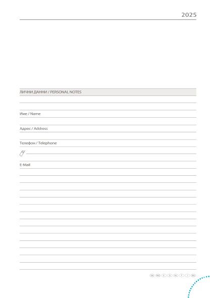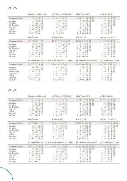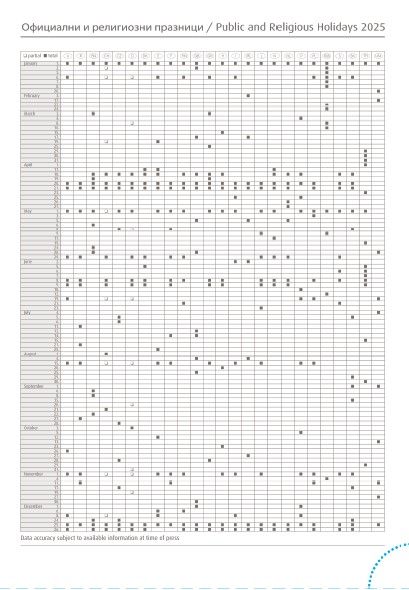 Размери: 14.5 х 20.5 cmС дати. Мултинационално тяло, осем езика вкл. български, заглавна страница, официални и църковни празници в България и 24 страни. Хартия бял офсет. Текстилна лента за отбелязване. Перфорация на ъглите.