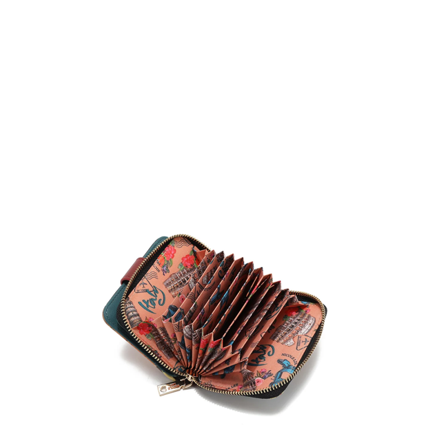 Гладка външна част. Закопчаване с цип и тик - так копче с гравирано лого и сърце. Гравирана табелка с име и дръжка на цип във формата на сърце. Златист обков. Вътрешна подплата от полиестер с премиум щампа. Предно отделение, отварящо се до 1 прозорец за лична карта, 5 слота за карти, 1 джоб за пари. Отделение с цип с 2 вътрешни слота за банкноти и 9 вътрешни слота за карти тип акордеон ( побира до 25 карти ). Включва подаръчна кутия. RFID ( радиочестотна идентификация ) технология за блокиране против кражба.Борбата срещу кражбата на самоличност започва с вашия портфейл.RFID технологията за блокиране предотвратява проникването на сигнали от четящо устройство в потфейла ви, за да запази съдържанието ви защитено. Размери: 8,8 см х 10,8 см х 3,8 см.