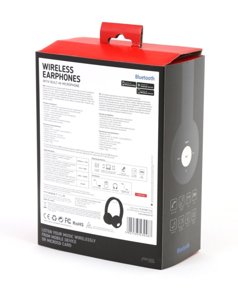 Bluetooth 5.0. Възможност за свързване с телефон или лаптоп с 3,5 mm mini jack. USB кабел за зареждане. С микрофон. Сгъваеми. Слот за micro SD карта. FM радио. Обхват: 10 метра. Батерия: 4000 mAh. Време за възпроизвеждане на звук: до 8 часа. Време за реждане: 2 часа. Тегло: 150 гр