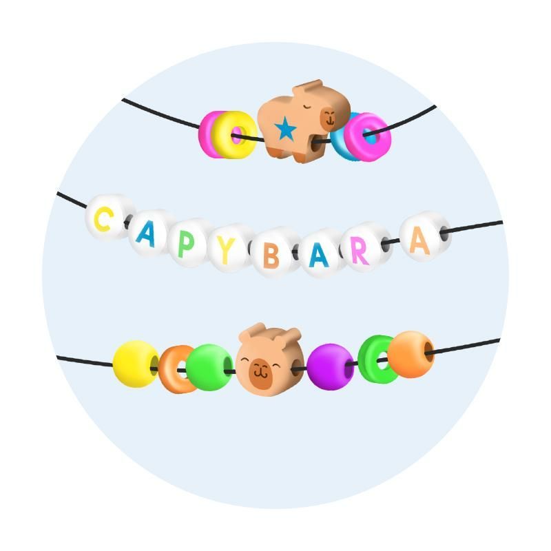 Бъдете креативни! Станете дизайнер на бижута и нанижете своето любимо бижу - идеално за гривни, колиета, ключодържатели и много други. Съдържание: над 200 различни мъниста ( цветни дискове с диаметър приблизително 6 мм, дискове с букви с диаметър приблизително 6 мм, топчета с диаметър приблизително 5 мм, капибара, лица на капибара) в различни неонови цветове и с 2 метра еластична корда. Размери на продукта, включително опаковката: 7,0 см х 1,5 см х 10,7 см.