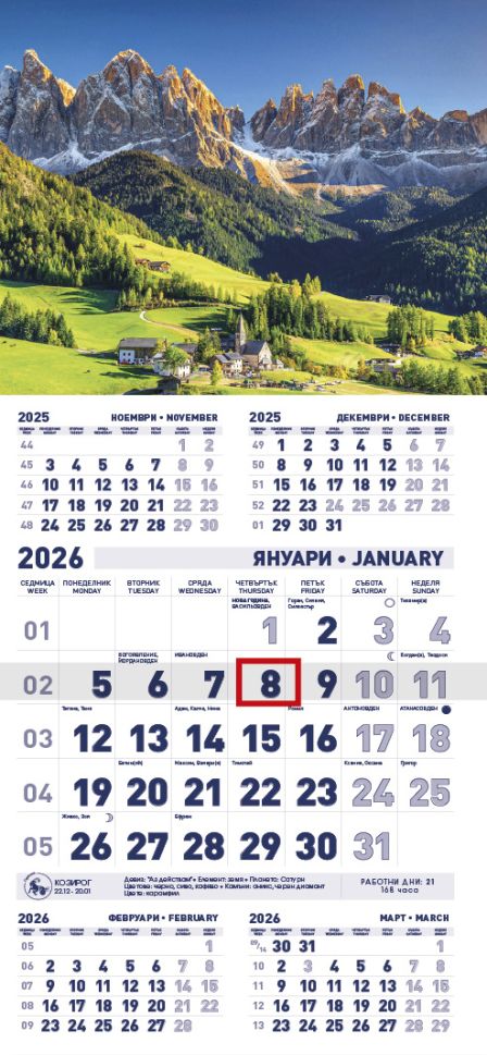 Разгънат формат: 56 x 27 cm. Тяло: 12 листа (месеца), финландски офсет, печат 1 цвят син, 2 езика. С прозорче и дупка за окачване.