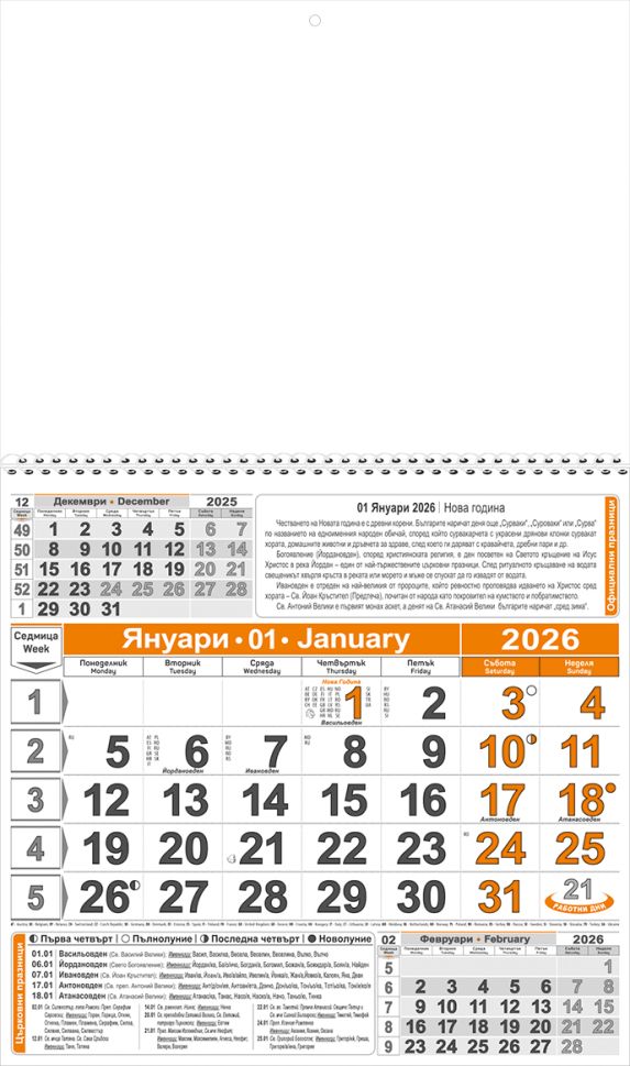 1 тяло върху бяла подложка.Подложка: 29.2 х 27.7 cm, 450 g/m2 едностранно хромов картон.Тяло: 29.2 х 27.7 cm, 12 листа. Офсет. 2 цвята печат. Официалнии църковни празници в България, официални празници в 30страни. С отбелязани имени дни и фази на луната, пореденномер на седмицата, начало на зодиакален знак.Захващане: с метална спирала.Възможност за глава (рекламна площ) размер - 29.2 х 20 cm.Възможност за изработване на календар с цветна глава поиндивидуален дизайн или готов дизайн по каталог
