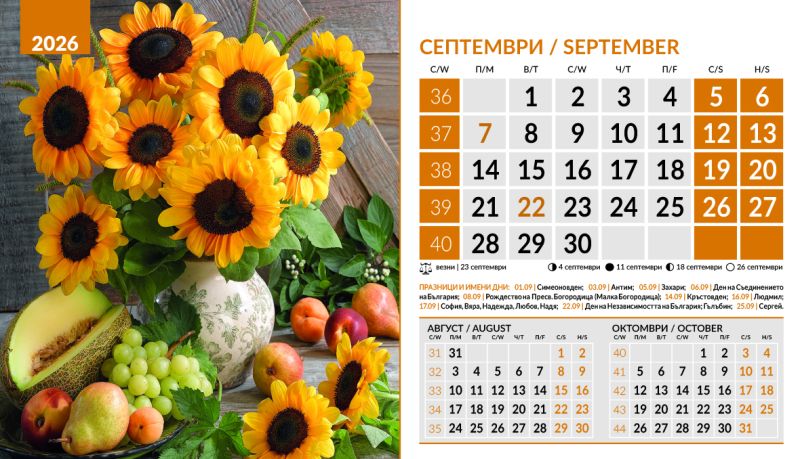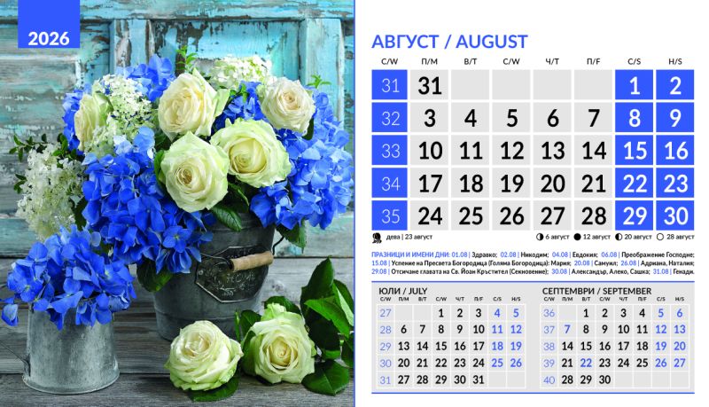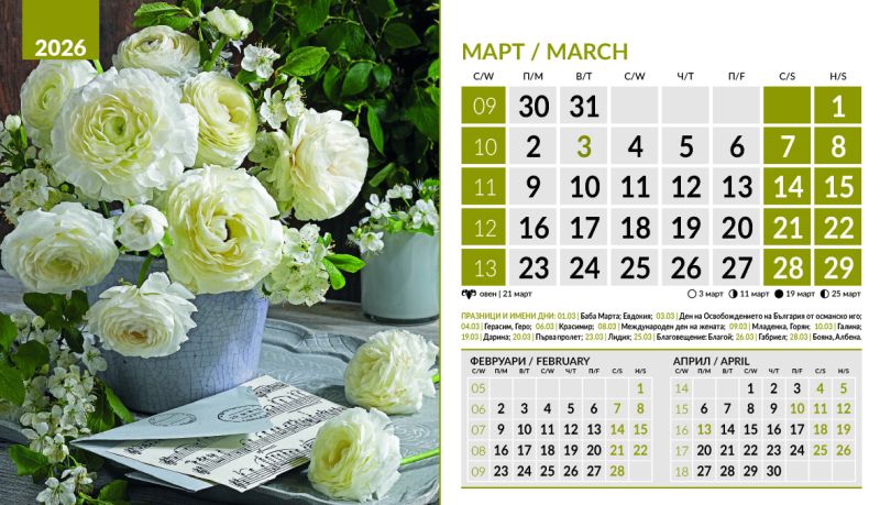 Тяло 12 листа (месеца), двустранен хром гланц, цветност: 4+0. Отбелязани празници и имени дни, лунни фази, зодии Корица: 200 g/m2 гланц с UV лак Основа: 280 g/m2 бял опаковъчен картон Рекламна площ 19.5 x 3 cm върху основата. Възможност за пълноцветен печат на основата при тираж над 500 броя Възможност за ситопечат 1 цвят при тираж над 100 броя или пълноцветен дигитален печат на стикер при тираж над 50 броя 19.5 x 11.2 cm