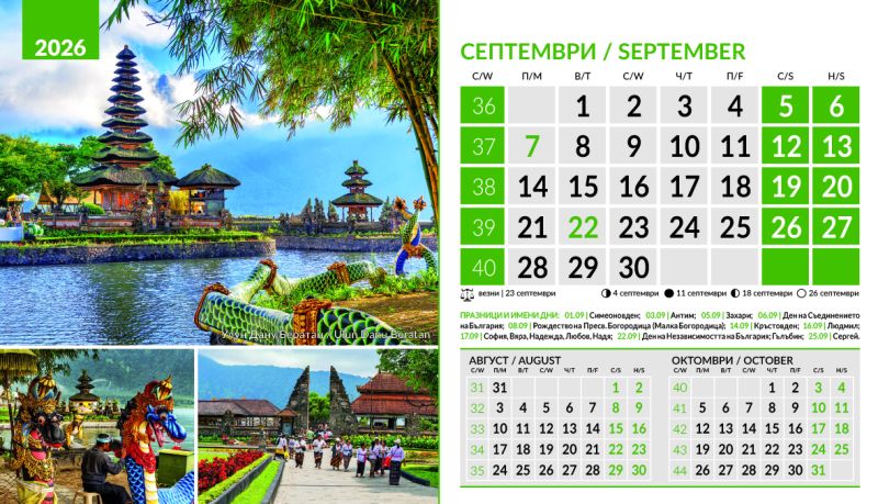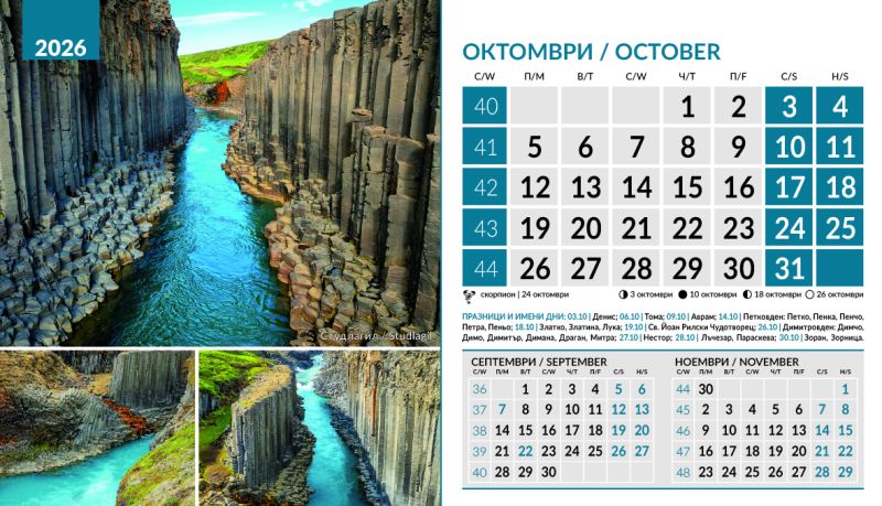 19.5 x 11.2 cmТяло 12 листа (месеца), двустранен хром гланц, цветност: 4+0.Отбелязани празници и имени дни, лунни фази, зодииКорица: 200 g/m2 гланц с UV лакОснова: 280 g/m2 бял опаковъчен картонРекламна площ 19.5 x 3 cm върху основата