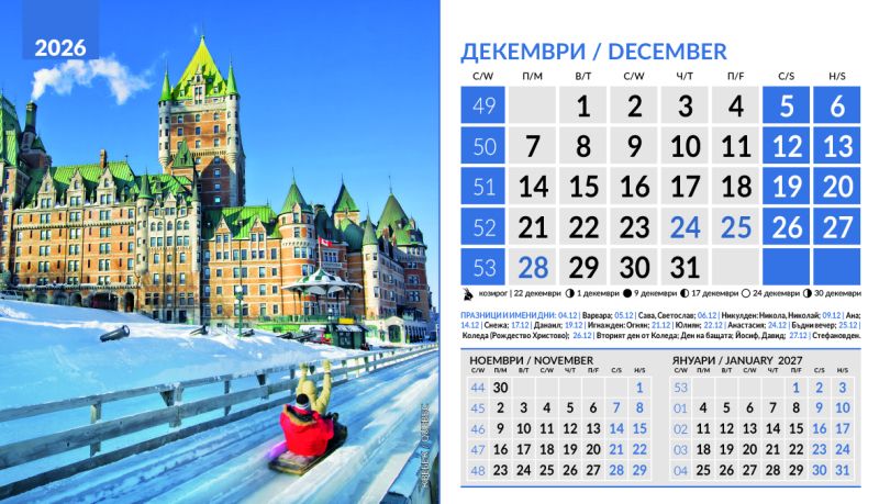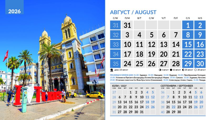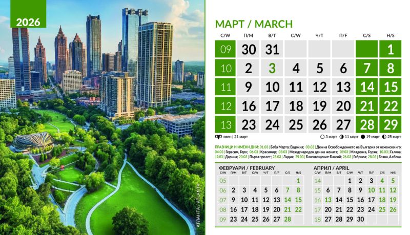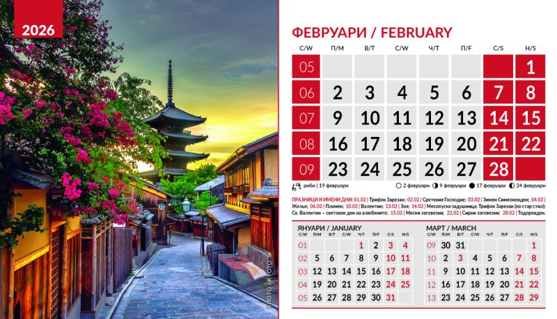 Тяло 12 листа (месеца), двустранен хром гланц, цветност: 4+0. Отбелязани празници и имени дни, лунни фази, зодии Корица: 200 g/m2 гланц с UV лак Основа: 280 g/m2 бял опаковъчен картон Рекламна площ 19.5 x 3 cm върху основата. Възможност за пълноцветен печат на основата при тираж над 500 броя Възможност за ситопечат 1 цвят при тираж над 100 броя или пълноцветен дигитален печат на стикер при тираж над 50 броя 19.5 x 11.2 cm