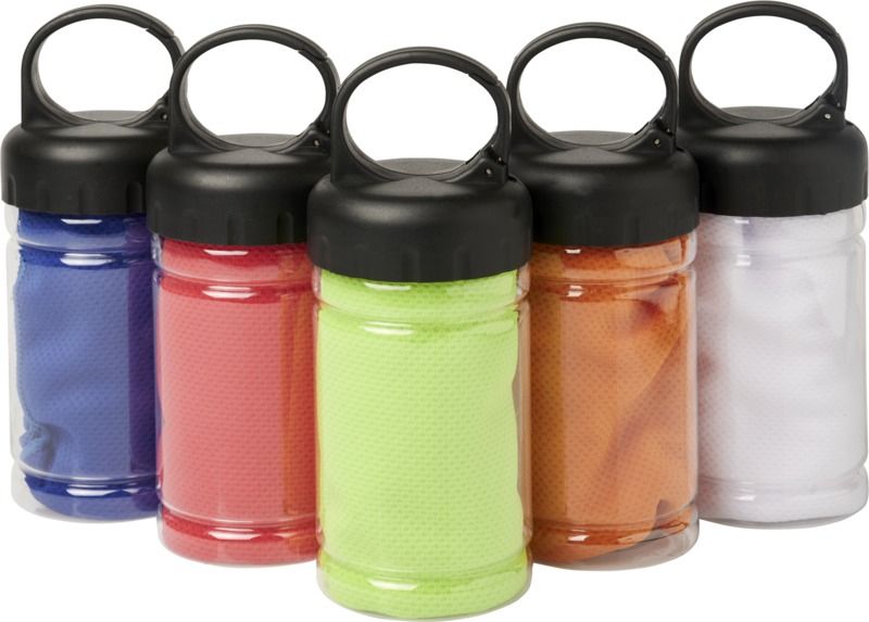 Бързоабсорбираща и бързосъхнеща охлаждаща кърпа от полиестер. В пластмасов контейнер с дръжка за носене с вграден карабинер. 30 х 80 cm