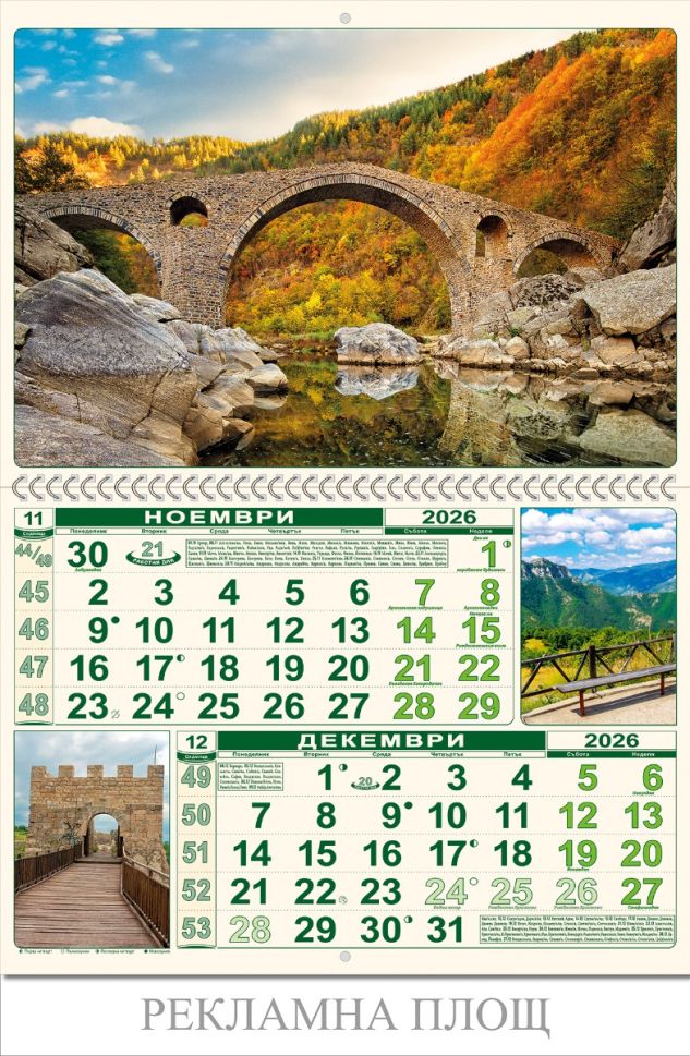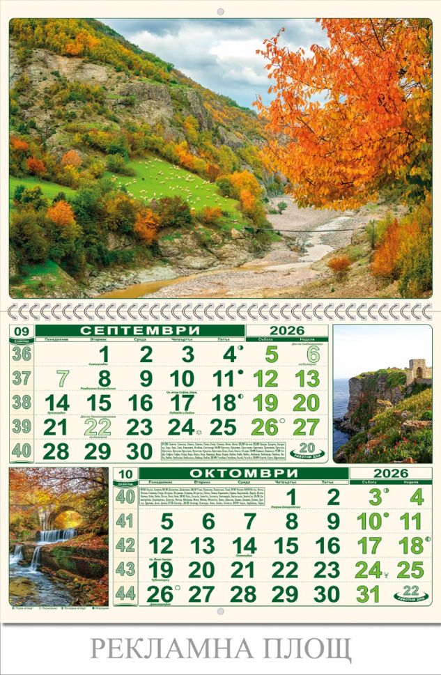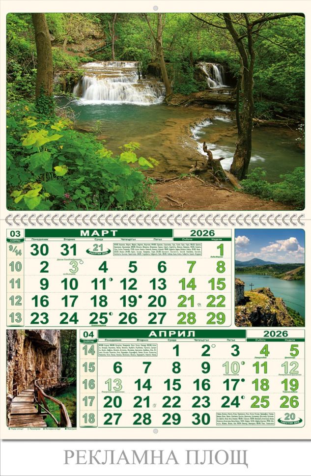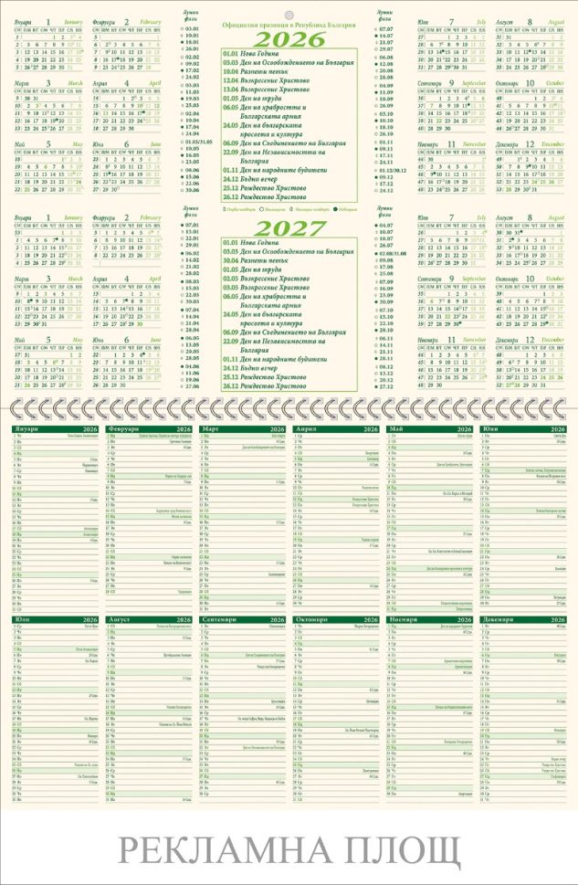Сгънат формат: 34 х 24 cm + 4 cm удължена корица Разгънат формат 34 х 52 cm Тяло: 6 листа (по 2 месеца на лист), двустранен хром гланц, цветност 4+4, UV лак. Отбелязан пореден номер на седмицата, официални и църковни празници, имени дни, фази на луната, зодии, DST Корица: двустранен хром гланц, цветност 4+4 + UV лак. Захващане с метална спирала Рекламна площ 34 х 4 cm Сгънат формат: 34 х 24 cm + 4 cm удължена корица Разгънат формат 34 х 52 cm Тяло: 6 листа (по 2 месеца на лист), двустранен хром гланц, цветност 4+4, UV лак. Отбелязан пореден номер на седмицата, официални и църковни празници, имени дни, фази на луната, зодии, DST Корица: двустранен хром гланц, цветност 4+4 + UV лак. Захващане с метална спирала Рекламна площ 34 х 4 cm