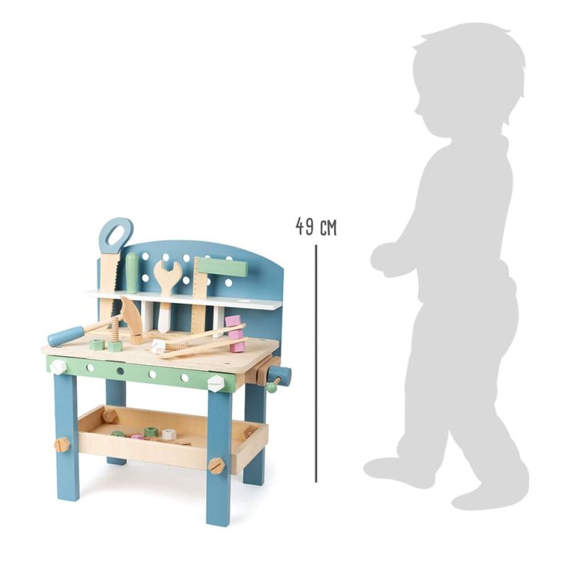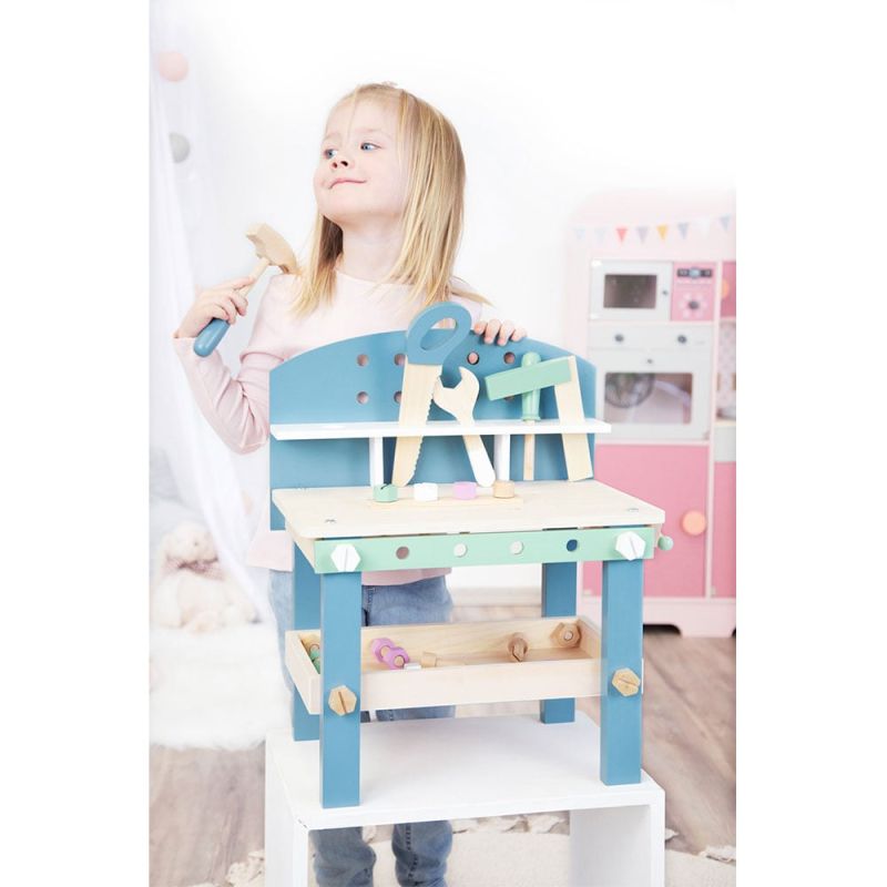 Дървената работилница, насърчава сръчността на децата. Завиването на болтчета и рязането с трион ще стимулират фините двигателни умения у децата. Приятните цветове, изчистените форми и семплият скандинавски дизайн са подходящи както за момичета, така и за момчета.