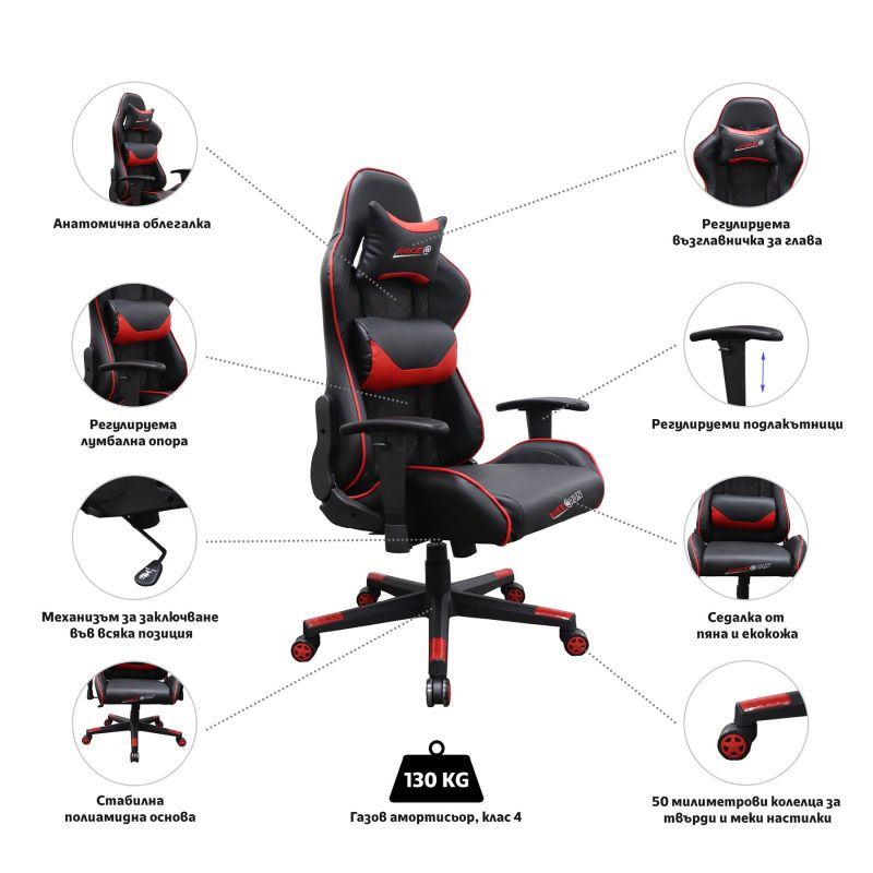 Геймърски стол RFG Race@Run, екокожа, полиамидна основа, до 130 kg, черна седалка, червена облегалка