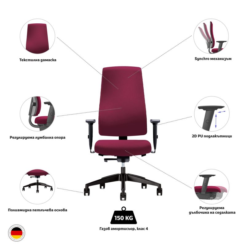 Ергономичен стол Interstuhl Goal 24/7, текстил, Synchronous механизъм, полиамидна основа, до 150 kg, бордо