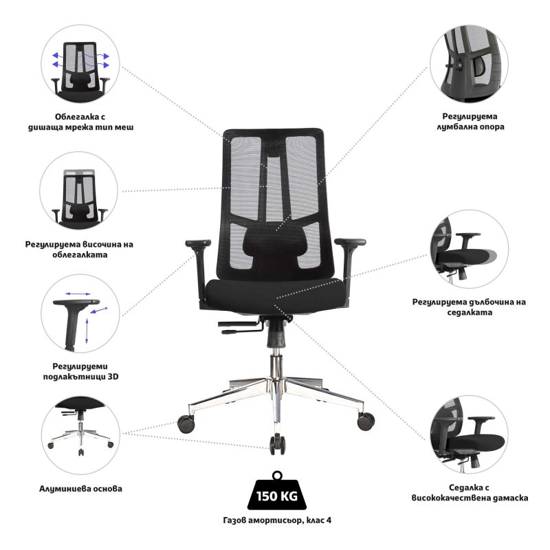 Ергономичният стол Artur съчетава класически стил, модерен дизайн и изключителен комфорт. Подходящ е за различни пространства за работа. С невероятния си стилен дизайн ще се превърнат в перфектен завършек на Вашия офис! Облегалката е изработена от специална материя тип „меш“, а седалката е проектирана с висококачествена пяна и текстилна дамаска, осигурявайки удобство, като същевременно се грижи тялото на посетителя Ви да остане в правилна и продуктивна позиция.