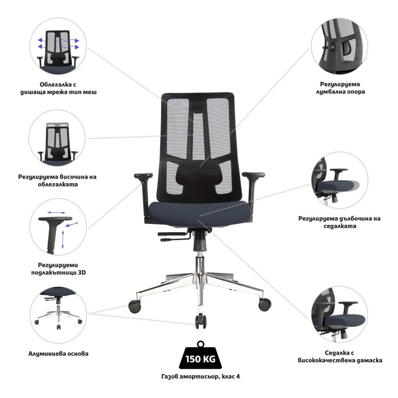 Седалката е проектирана с висококачествена пяна и текстилна дамаска, осигурявайки удобство, като същевременно се грижи тялото Ви да остане в правилна и продуктивна позиция.