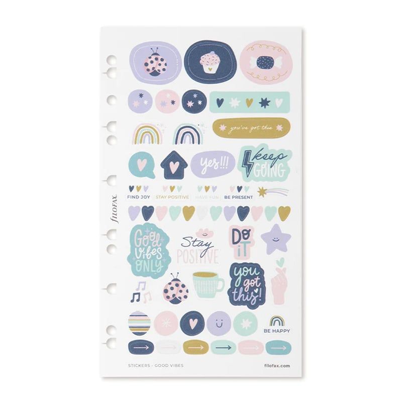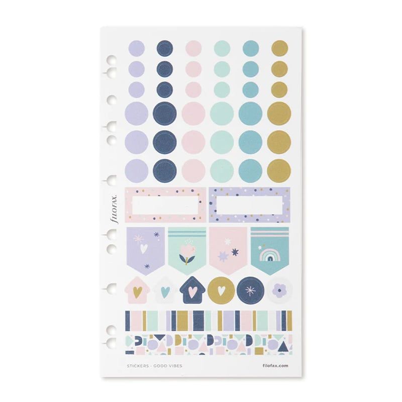 Комплектът включва 6 листа с общо 250 стикера в различни цветове от колекцията Good Vibes на марката Filofax.
