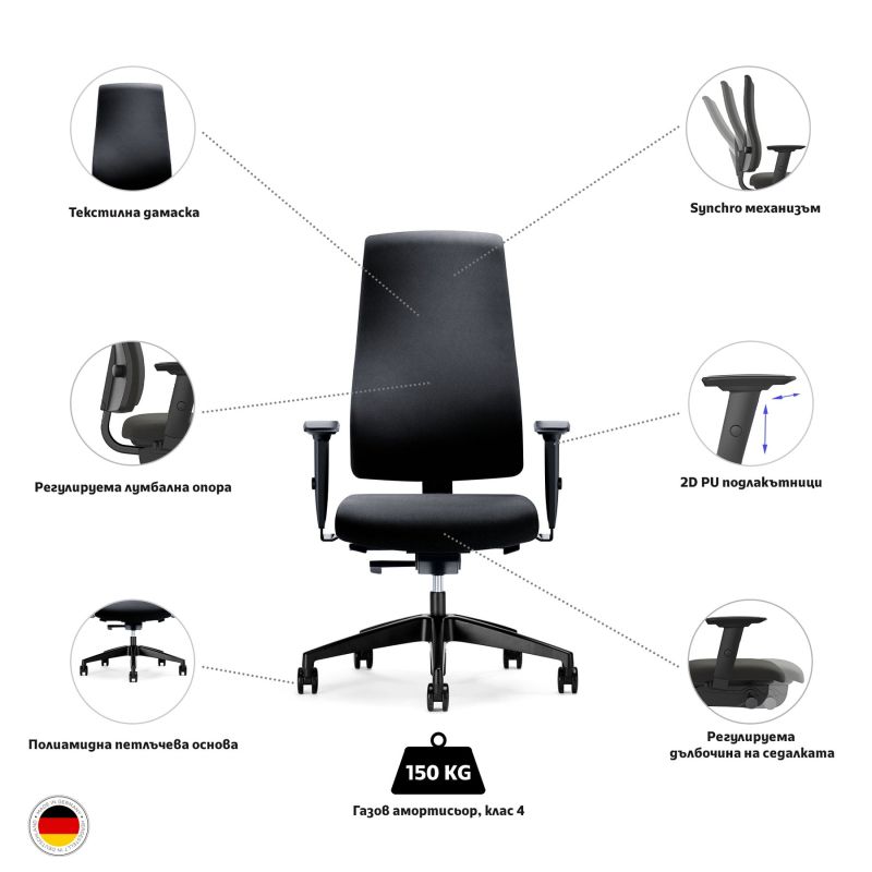 Ергономичен стол Interstuhl Goal 24/7, текстил, Synchronous механизъм, полиамидна основа, черен