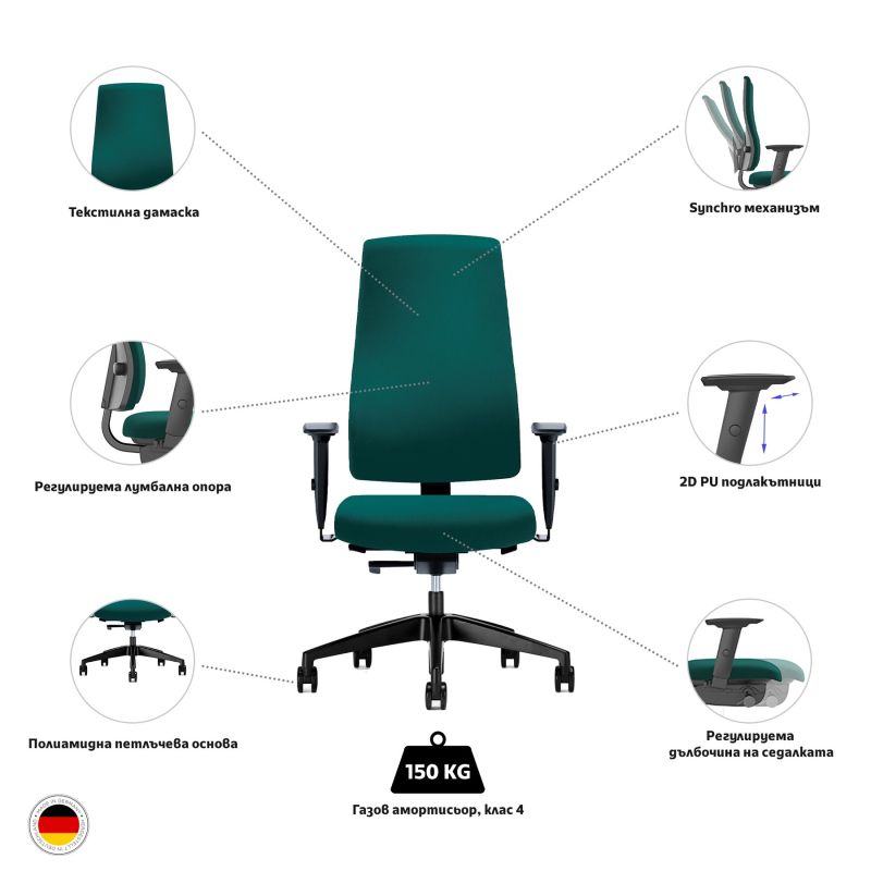 Ергономичен стол Interstuhl Goal 24/7, текстил, Synchronous механизъм, полиамидна основа, до 150 kg, син океан