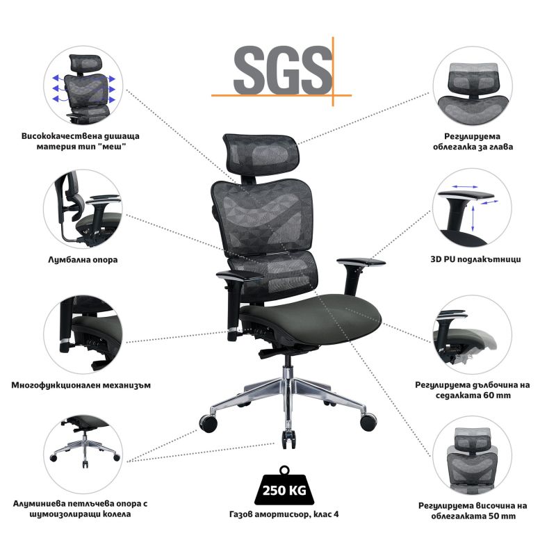 Ергономичен дизайн Ергономичният дизайн прави стола напълно подходящ за работно среда, в която се налага продължително седене на едно място.