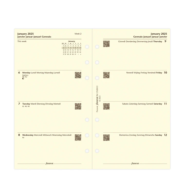 Filofax Пълнител за органайзер Classic, Personal, кремава хартия, за 2025 година, 1 седмица на 2 страници
