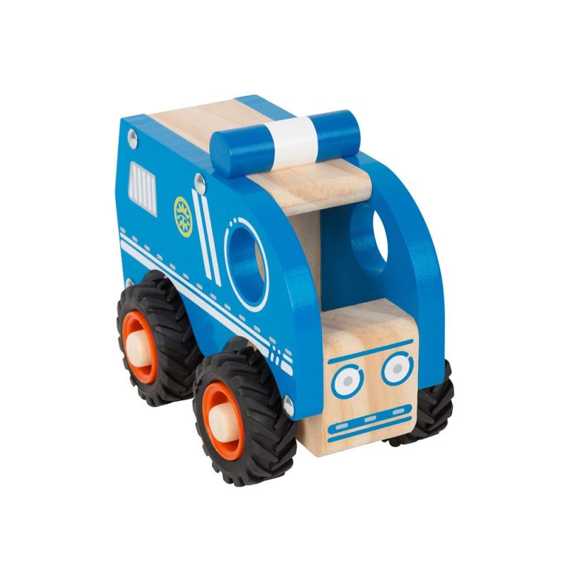 Дървената кола се ускорява по гладък и неравен терен със здравите си гумени колела. Ако крадецът бъде хванат, в багажника има място за него и малкият полицай може да го хвърли в затвора, докато седи на шофьорското място.Размери: 13 x 7 x 10 cm.