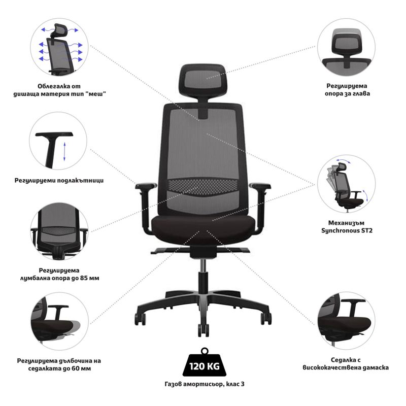 • Столът е оборудван с механизъм Synchronous ST2 за осигуряване на така нареченото динамично седене.