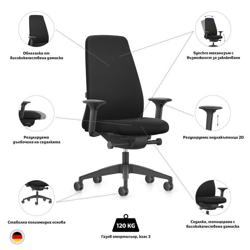 • Оптимална ергономичност, благодарение на лумбална опора с регулируема дълбочина.