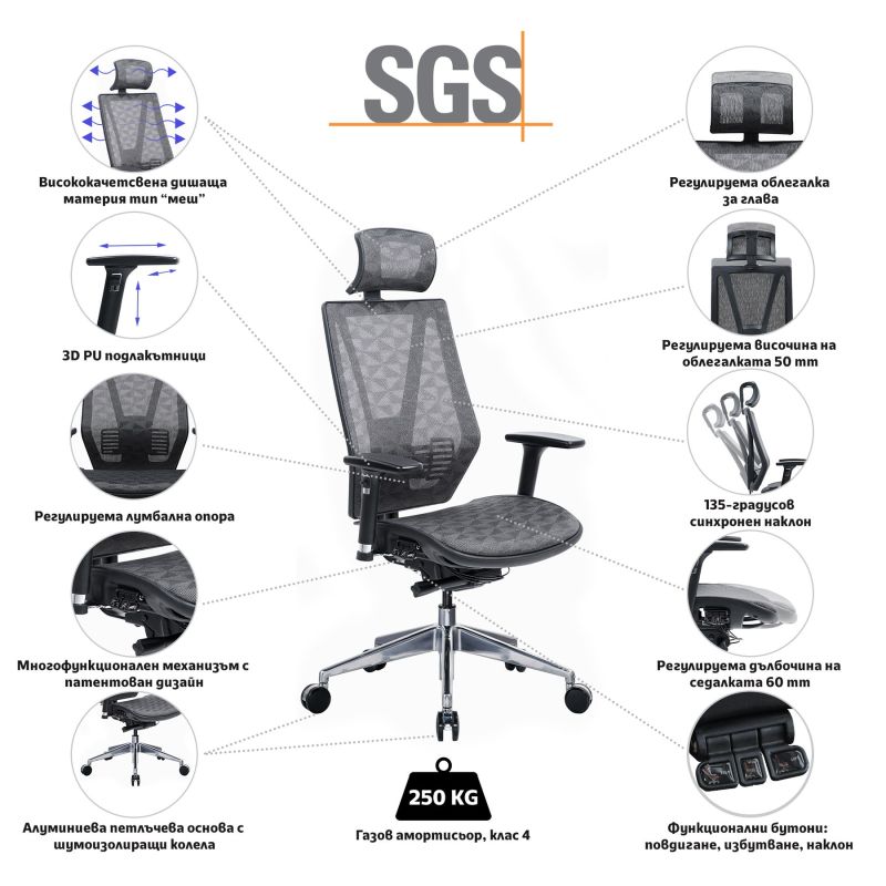 Регулируемата дълбочина на седалката и височина на облегалката, правят стола подходящ за всеки ръст. 3D подлакътници и опора за глава за още повече удобство през работния ден.