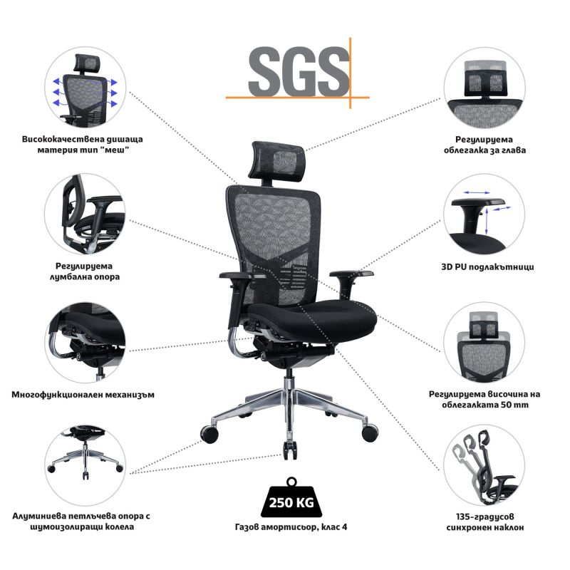 Регулируемата дълбочина на седалката и височина на облегалката, правят стола подходящ за всеки ръст. 3D подлакътници и опора за глава за още повече удобство през работния ден.