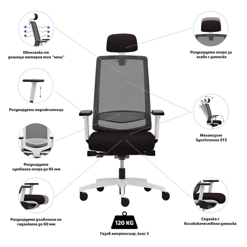 Ергономичен стол Rim Victory VI 1405 White, Synchronous ST2 механизъм, до 120 kg, черен