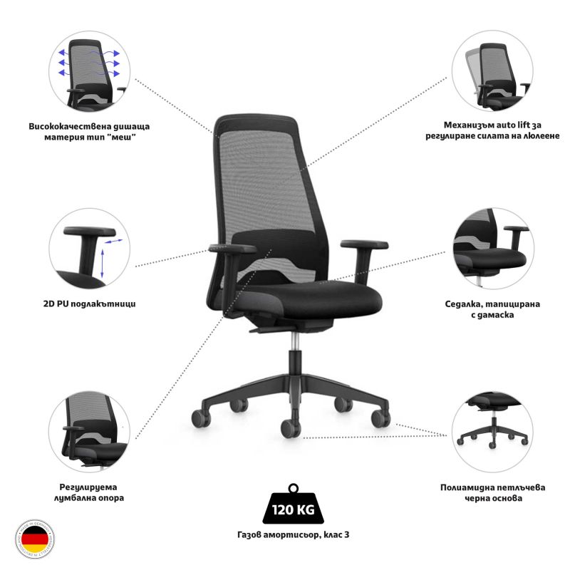 Твоето удобство няма цена, но е от огромно значение за твоята работоспособност и креативна мисъл. Този произведен в Германия стол, ще ти даде комфорта, от който се нуждаеш, за да работиш спокойно и да се чувстваш уютно. Отпусни се в меката седалка и остави облегалката от здрав „меш“ да те обгърне – сякаш си на облак! Върховно усещане за комфорт и ергономия.