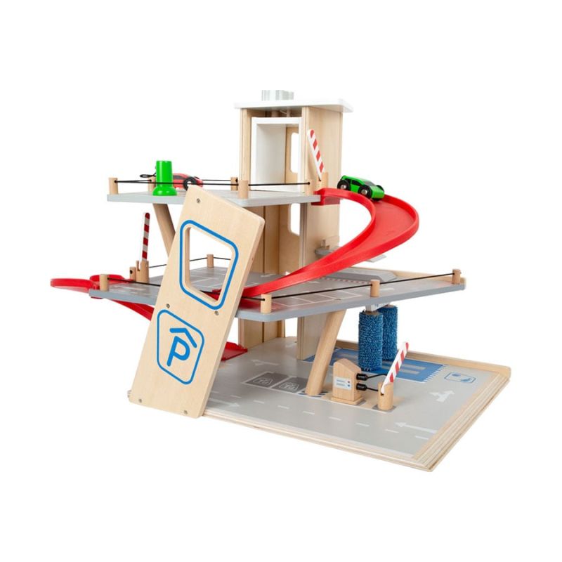 Дървен паркинг за коли с две включени играчки, които могат да бъдат паркирани на три различни нива.