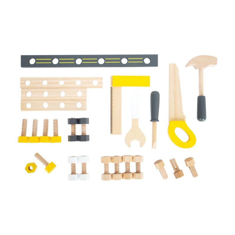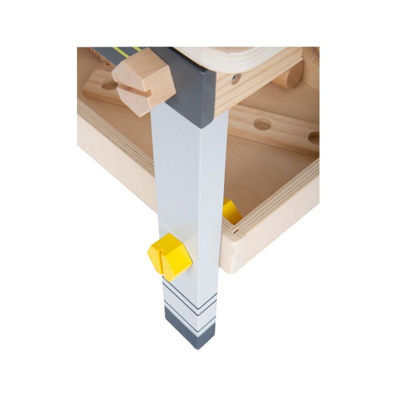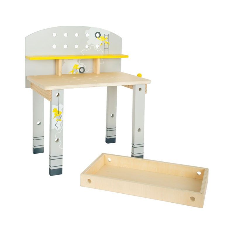 Работна дървена маса с инструменти, насърчаваща активната ролева игра при децата и тренираща техните ръчни умения.