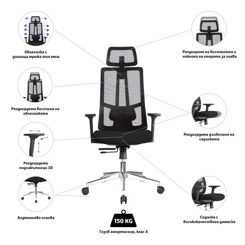 Седалката е проектирана с висококачествена пяна и текстилна дамаска, осигурявайки удобство, като същевременно се грижи тялото Ви да остане в правилна и продуктивна позиция.