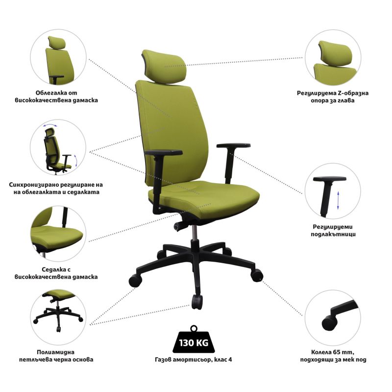 Ергономичен стол MJ Elani ST1 Z, директорски, ST1 механизъм, полиамидна основа, зелен, сглобена мостра