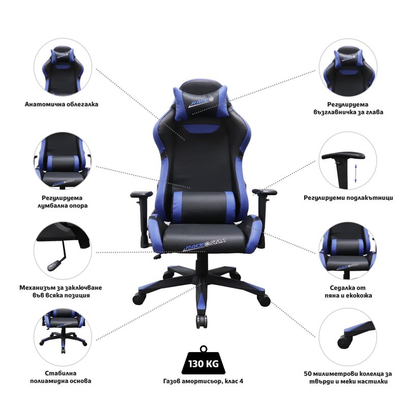 Геймърски стол RFG Race@Star, екокожа, полиамидна основа, до 130 kg, черна седалка, синя облегалка
