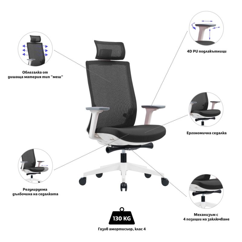 Ако се чудите как да сте по-продуктивни и по-добри в работата, опитайте с изцяло нова работна атмосфера. Започнете със смяната на стария стол с чисто нов ергономичен стол Meteor White HB, доставен специално от RFG! Получавате качество, стил и комфорт само с един продукт! Елегантната нежно бяла рамка ще проследи всяка извивка на Вашето тяло и ще Ви позволи да се отпуснете напълно и да забравите за умората и напрежението! Благодарение на анатомично излятата ергономична седалка, изработена от полиуретанова пяна, ще се чувствате като седящи в мек и пухкав облак!