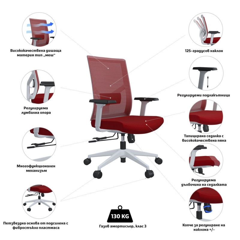 Ергономичен стол RFG Snow W, дамаска и меш, Multi-function механизъм, до 120 kg, червена седалка, червена облегалка