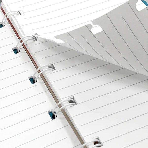 Кориците на тефтера са изработени от висококачествена синтетична кожа и са захванати със скрита спирала, което им позволява да се разгръщат до 360°, без опасност от деформация и изпадане на листовете.Тефтерите са създадени така, че да добавяте, местите или премахвате страници, без да се налага да ги късате.