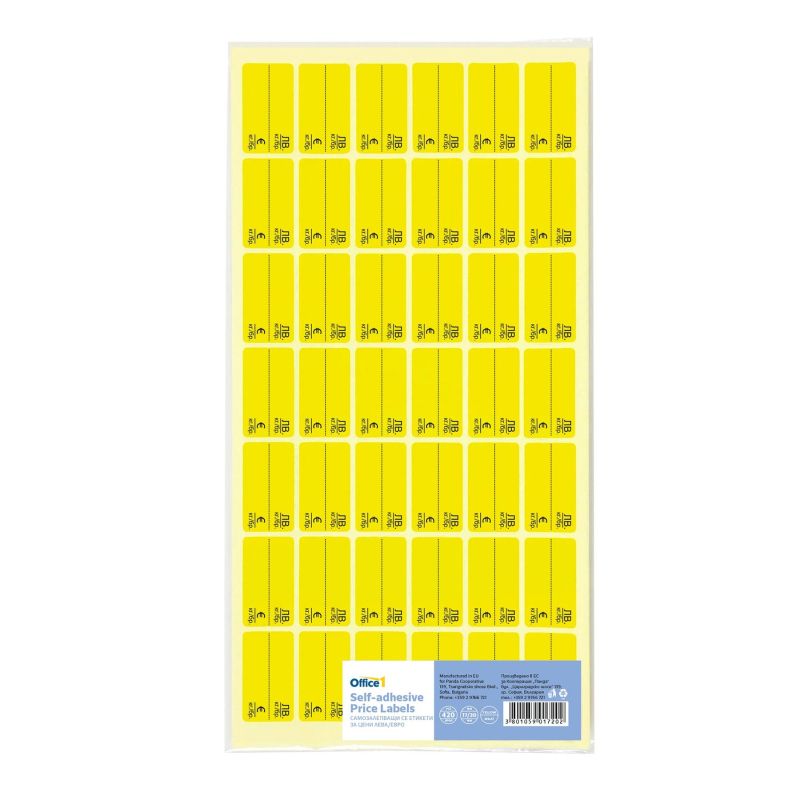 Office 1 Самозалепващи се етикети за цени, 17 x 30 mm, жълти, лева и евро, 420 броя