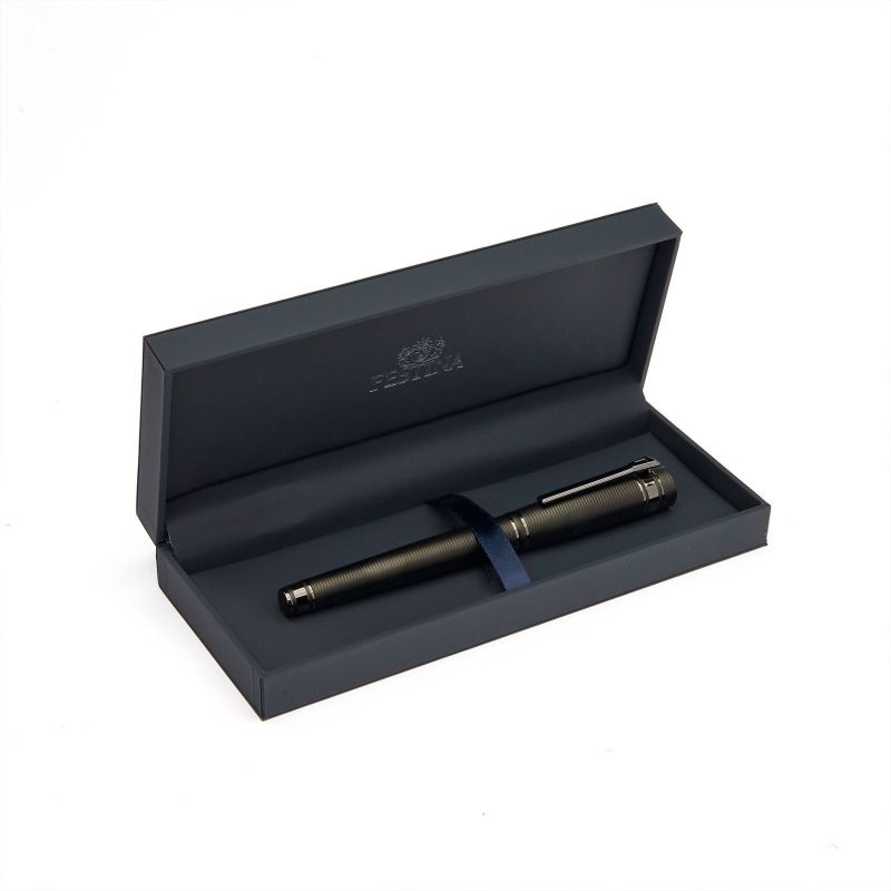 Писалката е гравирана с хоризонтални ивици с луксозно метално покритие и изискани детайли.