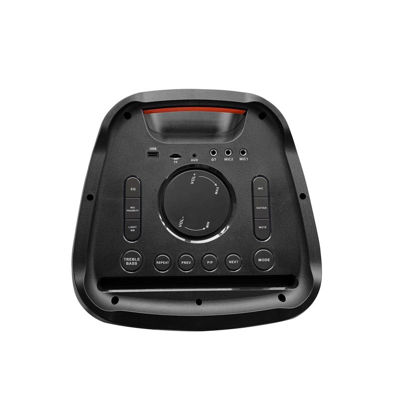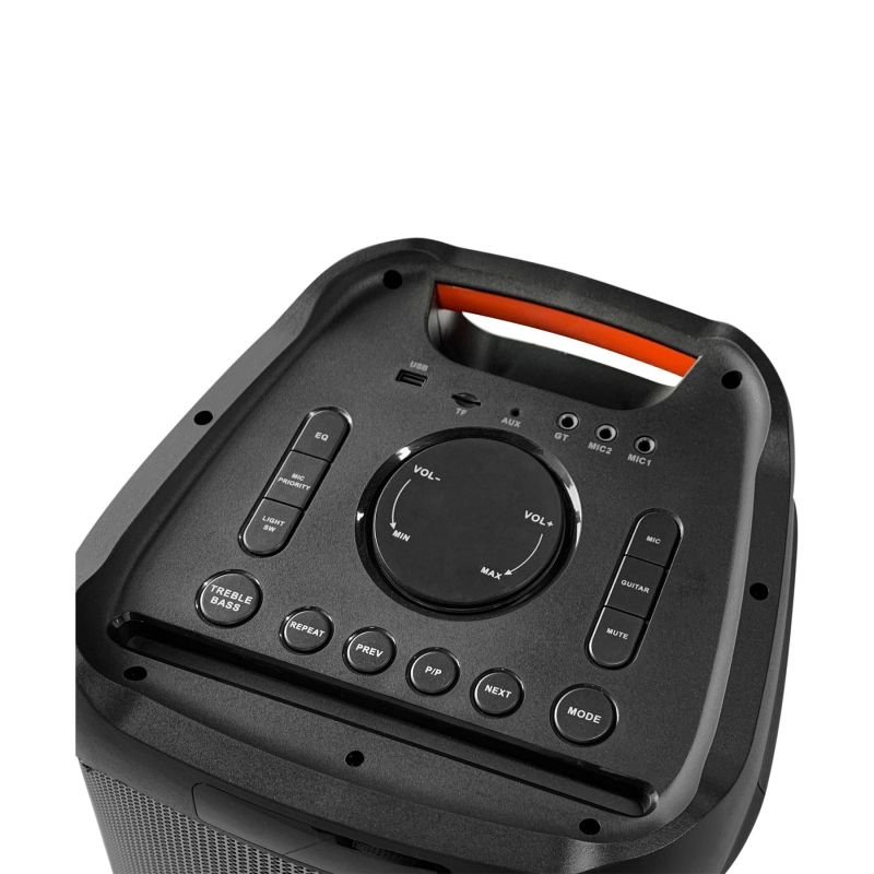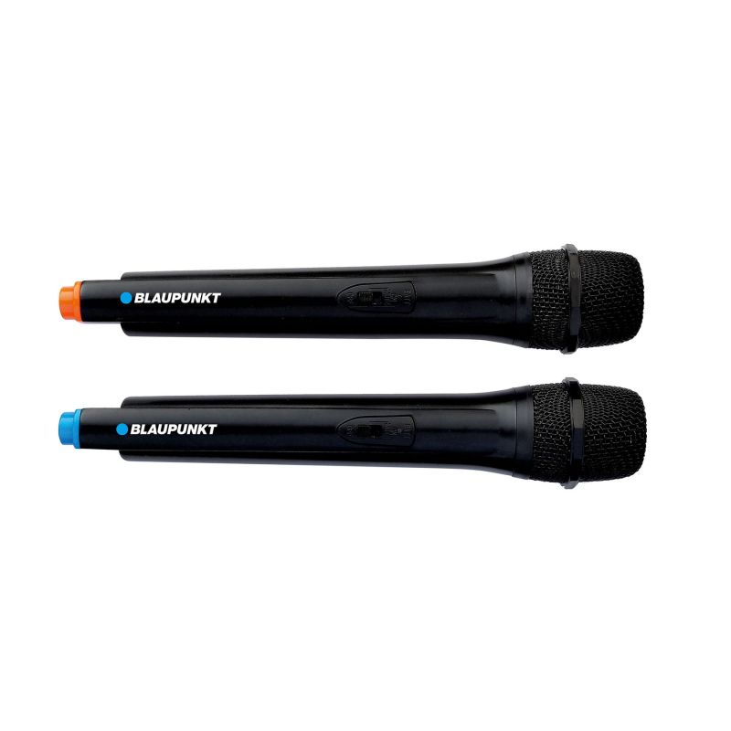 Комплектът включва два безжични микрофона, които автоматично се сдвояват с високоговорителя веднага щом бъдат включени. Просто включете микрофона и пейте! При използване на функцията караоке е налична опцията за приоритет на микрофона – това означава, че когато е включено, устройството автоматично ще заглуши фоновата музика, докато пеете. Ако се чувствате готови, активирайте опцията и пейте „а капела“! В режим на караоке можете да настроите силата на звука на микрофона, да настроите ехото, за да елиминирате ехото, и да настроите високите и басите, за да съответстват най-добре на тембъра. Основният панел има и две гнезда за допълнителни жични микрофони, които не са част от аксесоарите.
