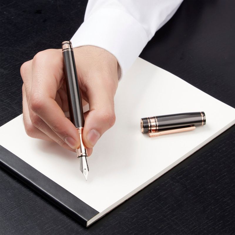 Писалката е гравирана с хоризонтални ивици с луксозно метално покритие и изискани детайли.