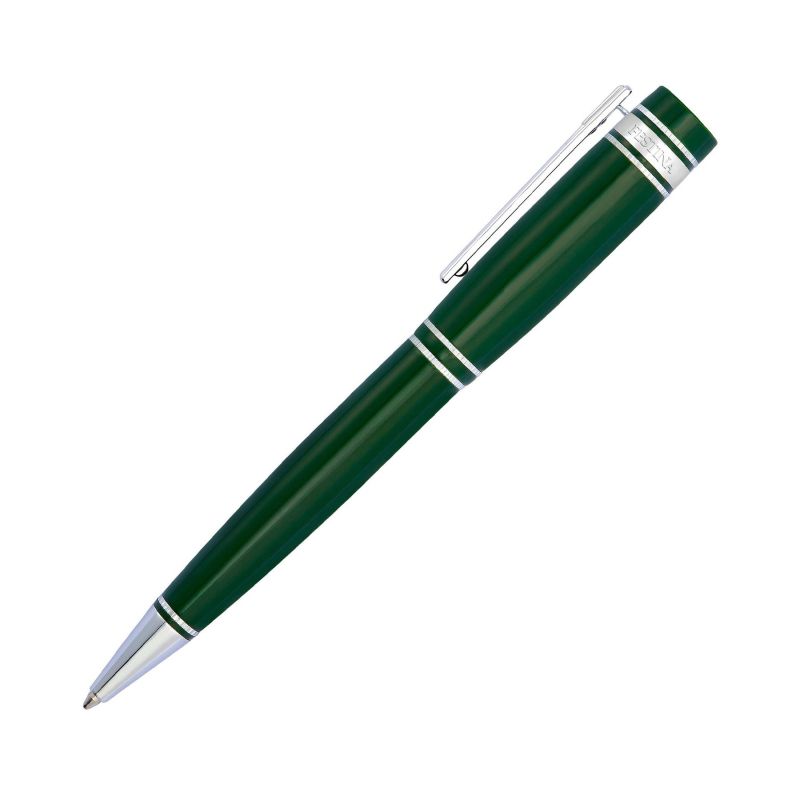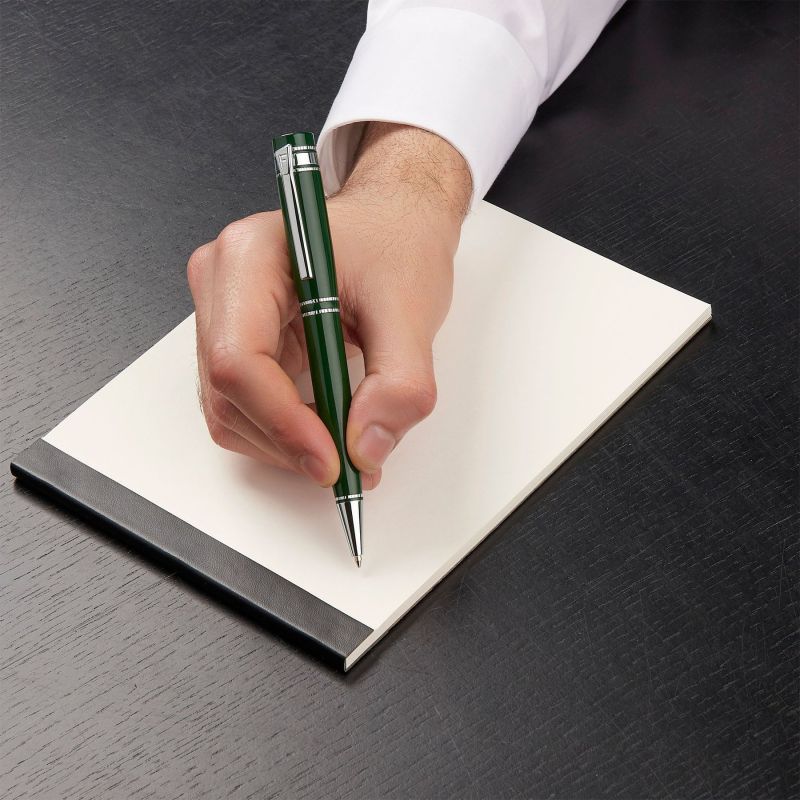 Леко уголеменият силует на автоматичната химикалка е завършен с лъскав лак и подсилен с хромирани акценти и детайлни гравюри.